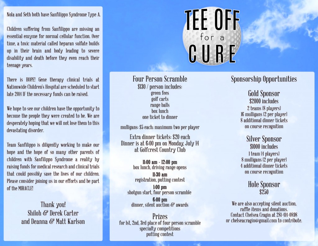 Yes, I would love to sign up to sponsor the Sanfilippo Awareness MPS Golf Scramble on May 15, 2014